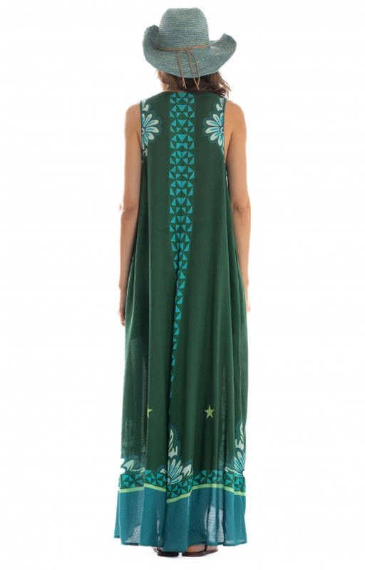 Abito mare lungo Pin-Up Stars in stile caftano dal design ampio e fluido realizzato in viscosa jacquard con ricami, dettagli preziosi di paillettes e stampa piazzata Tribal Sea. La stampa unisce l'energia spirituale polinesiana al fascino marino. La tartaruga, simbolo di protezione e viaggio, si trasforma in un mandala floreale, evocando armonia e connessione con la natura. L’abito è senza maniche, con tasche laterali e una vestibilità morbida che valorizza il movimento naturale del tessuto.