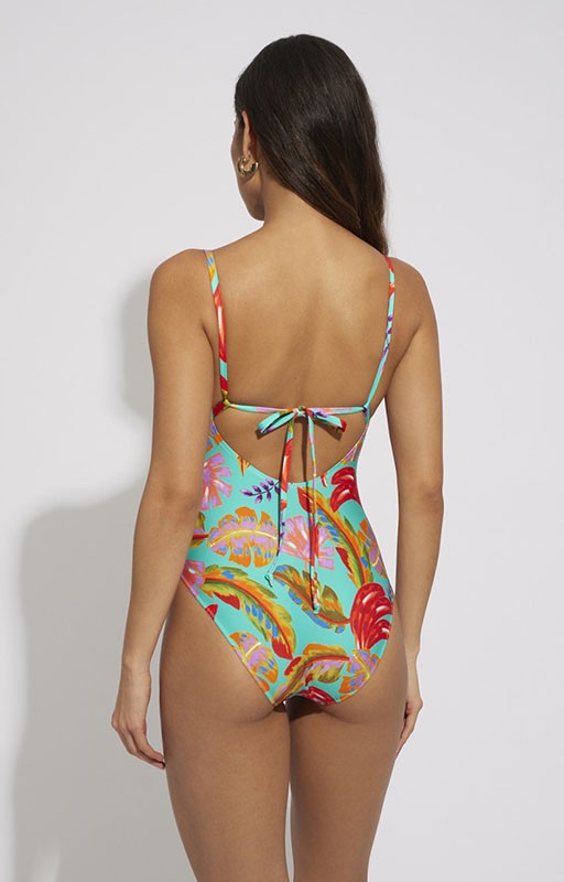 Costume intero Selmark con scollatura dal taglio triangolare, senza coppa interna e senza ferretto. Con una stampa colorata e vivace che donerà freschezza e vivacità alle tue giornate al mare o in piscina.