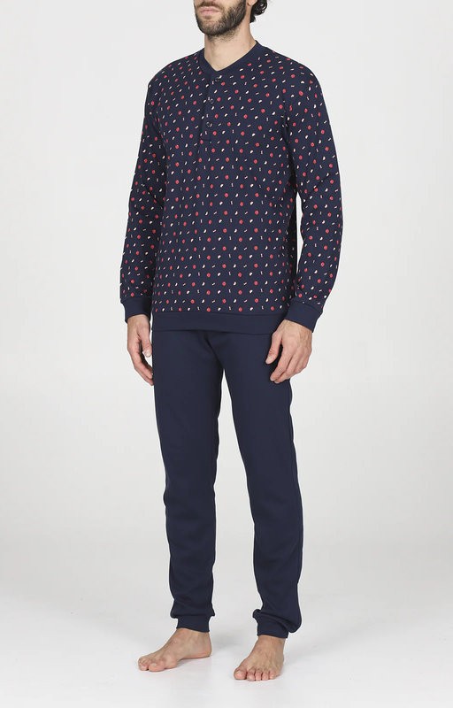 Pigiama da uomo Alpina dal design elegante e raffinato, perfetto per momenti di relax e comfort. La parte superiore presenta un colletto a serafino, arricchita da una stampa raffinata che aggiunge un tocco di originalità. Le maniche lunghe proteggono dal freddo senza compromettere la leggerezza del tessuto. I pantaloni, abbinati in una tonalità blu scuro uniforme, garantiscono una vestibilità comoda e versatile.