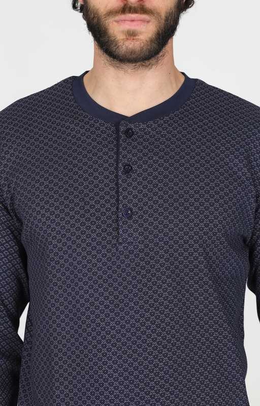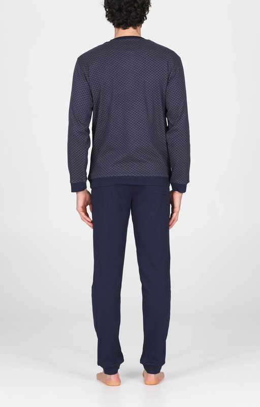 Pigiama da uomo Alpina modello Alfonso in interlock 36/1 di puro cotone: naturale, morbido, caldo e confortevole. Modello serafino con bordi. Giacca in elegante fantasia cravatteria e pantaloni in tinta unita. Adatto alle stagioni più fredde: un must have per l'inverno.
